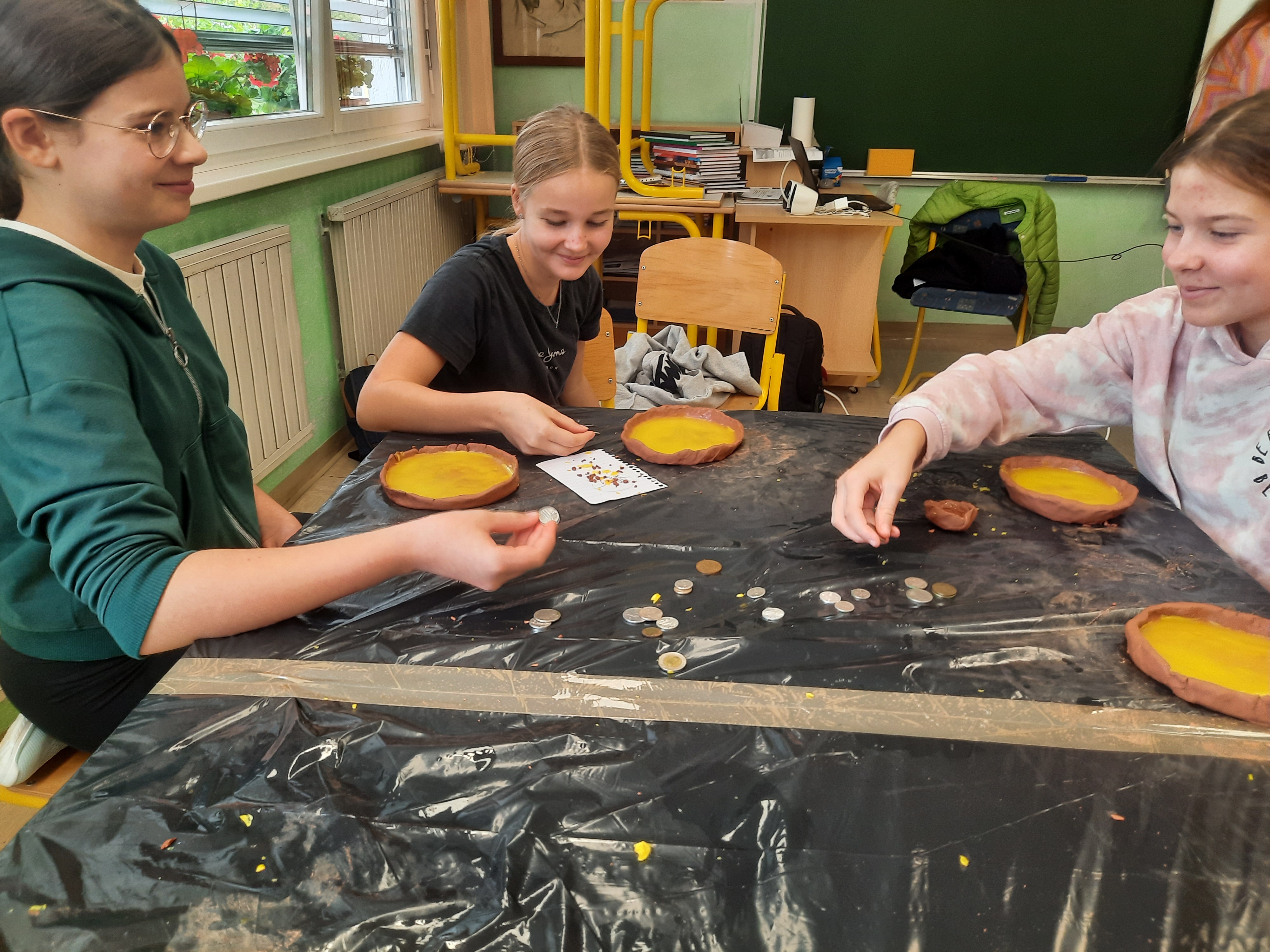 V sklopu projekta Rastem s knjigo, ki je namenjen spodbujanju in motiviranju mladih za branje kakovostne slovenske književnosti ter spodbujanju bralne kulture ter pozitivnega odnosa do knjige, smo najprej obiskali Knjižnico Radlje ob Dravi. Knjižničarka, ga. Helena Gosak, je učencem predstavila knjižnico in njeno ponudbo. Učencem je predstavila tudi pomen splošnih knjižnic, enote Knjižnice Radlje ob Dravi ter široko mrežo knjižnic po Sloveniji. Učenci so prejeli knjigo Nine Mav Hrovat: Orientacisti – Škorpijonov pik. Prav tako je bil dan namenjen tudi spoznavanju kulturne in zgodovinske dediščine domačega kraja. Obiskali smo Kovaški in gasilski muzej Muta. Po muzeju nas je vodila županja, ga. Angelca Mrak, ki je predstavila pomembne izseke iz zgodovine Mute. Kulturni dan smo zaključili z delavnico Vlivanje rimskih novcev. Kustosinja iz Koroškega pokrajinskega muzeja je učencem najprej predstavila zgodovino nastanke denarja, nato pa so si učenci izdelali novec. V glinen podstavek z vzorcem so vlivali vosek in oblikovali novec.