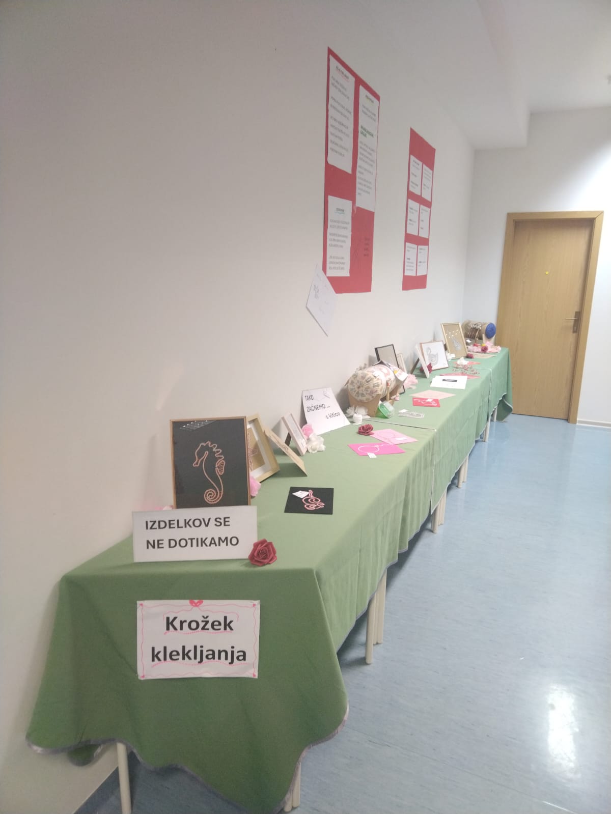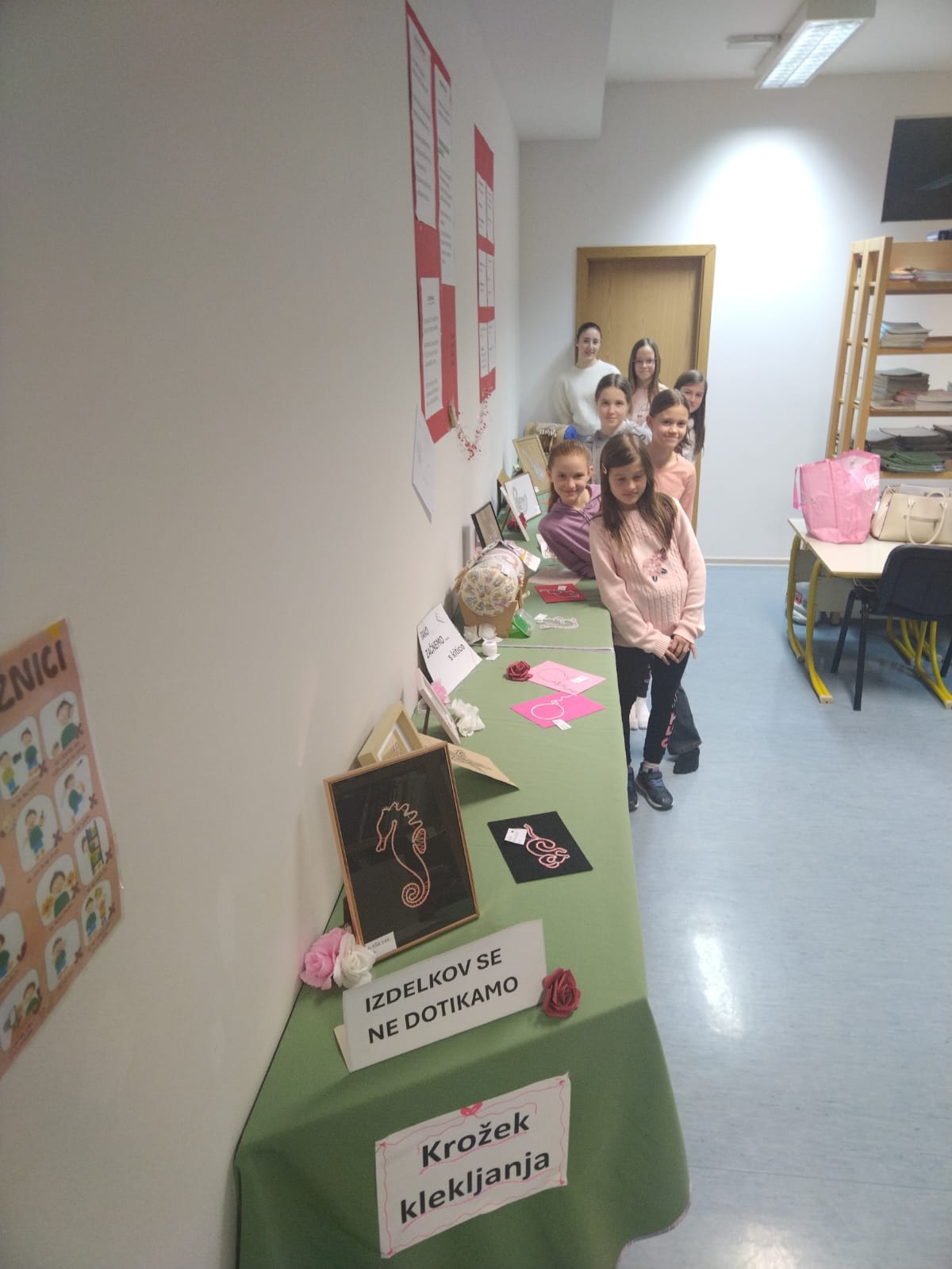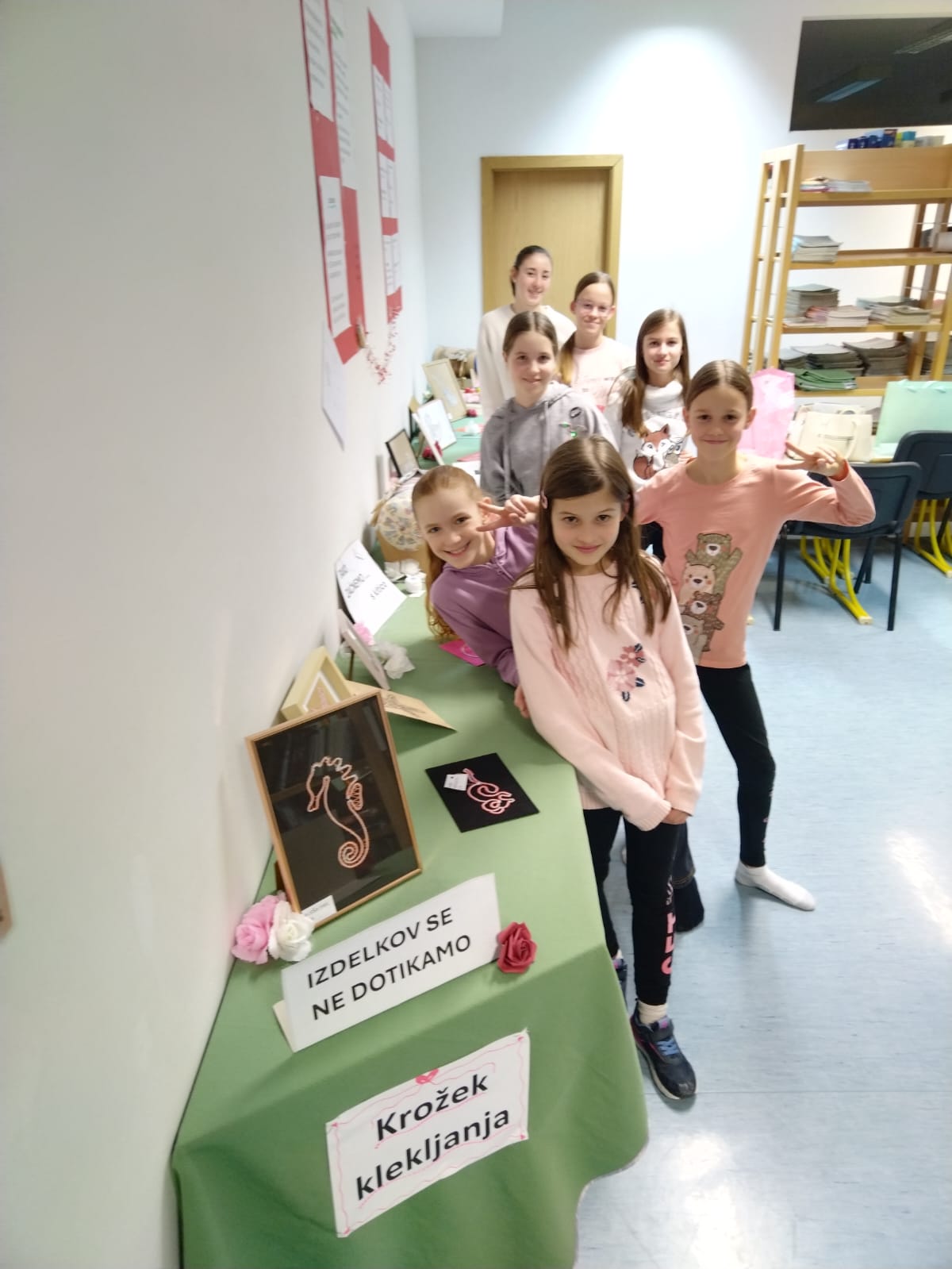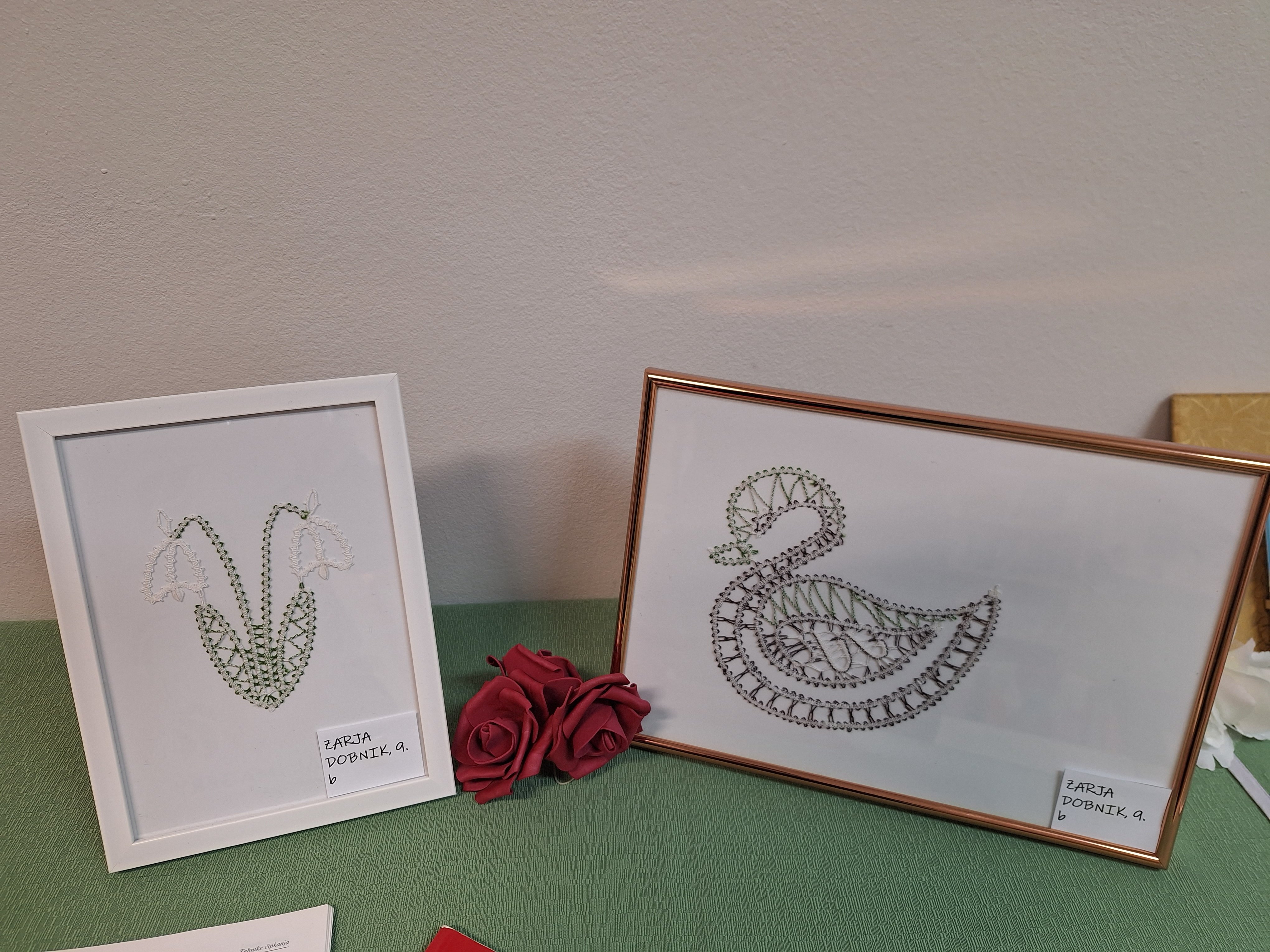 Klekljanje obiskujeva že šest let (Aleša) in devet let (Zarja). Izdelali sva že kar nekaj vzorčkov, ki so bili prejšnji teden na razstavi v naši šolski knjižnici. Tam so bili razstavljeni tudi izdelki mlajših učenk. Letos hodiva h krožku zadnje leto, zato se bova s tem ukvarjali samo še občasno. Imeli sva se super in zelo bova pogrešali popoldansko druženje z njimi. Mentorici Sonji Topler se iskreno zahvaljujeva za vso spodbudo in znanje, ki nama ju je v tem času predala.