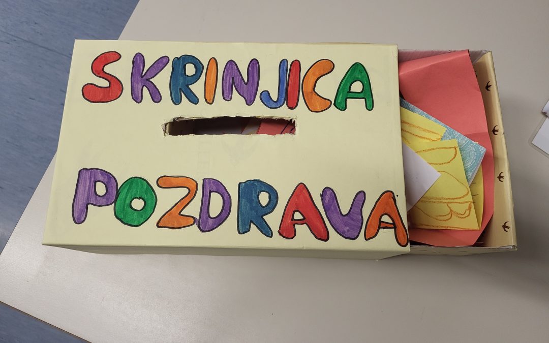 V avli šole je stala pozdravna skrinjica, v katero so učenci odlagali prijazne misli, pozdrave in pohvale. Nabralo se je veliko lepih sporočil.