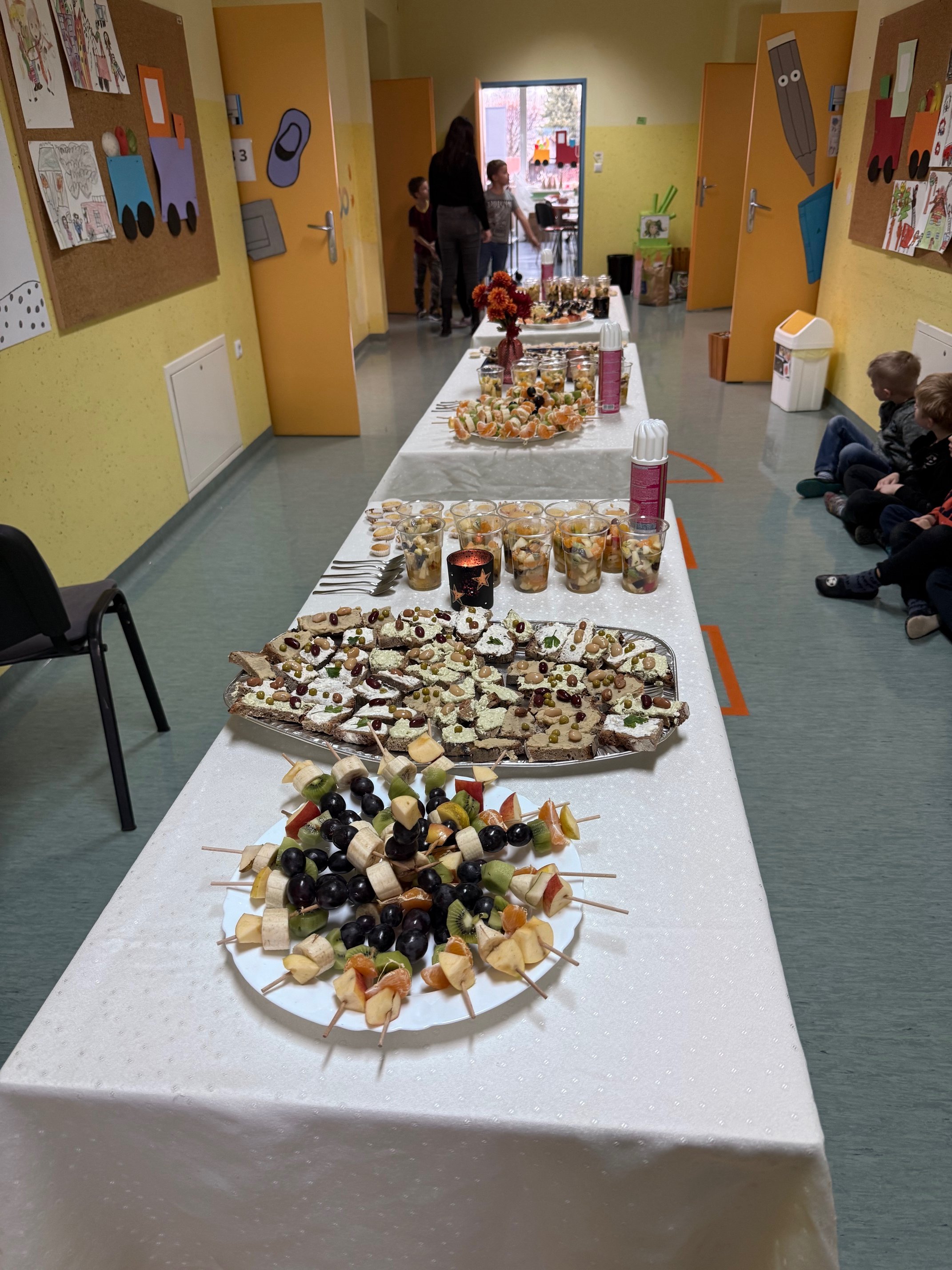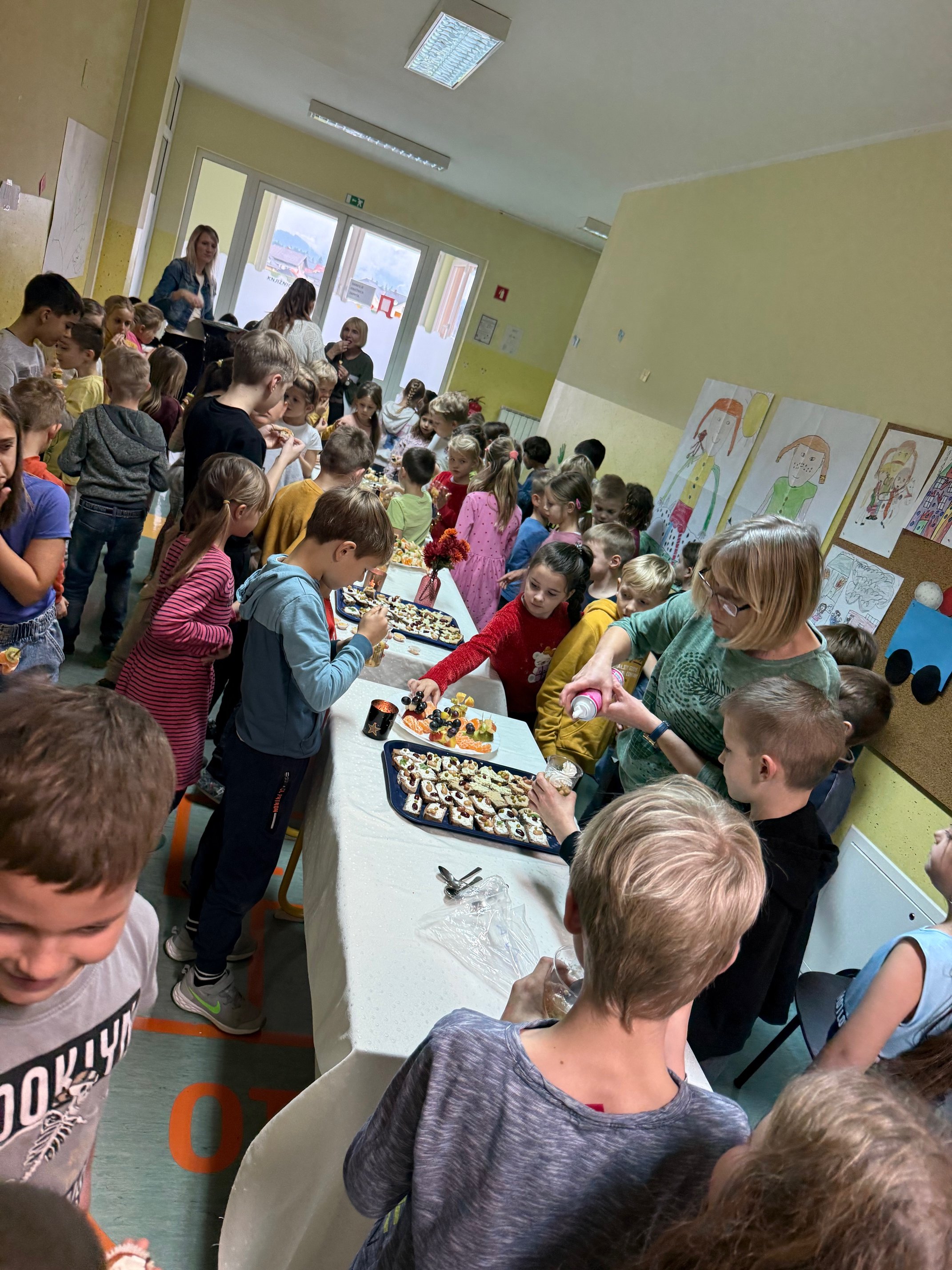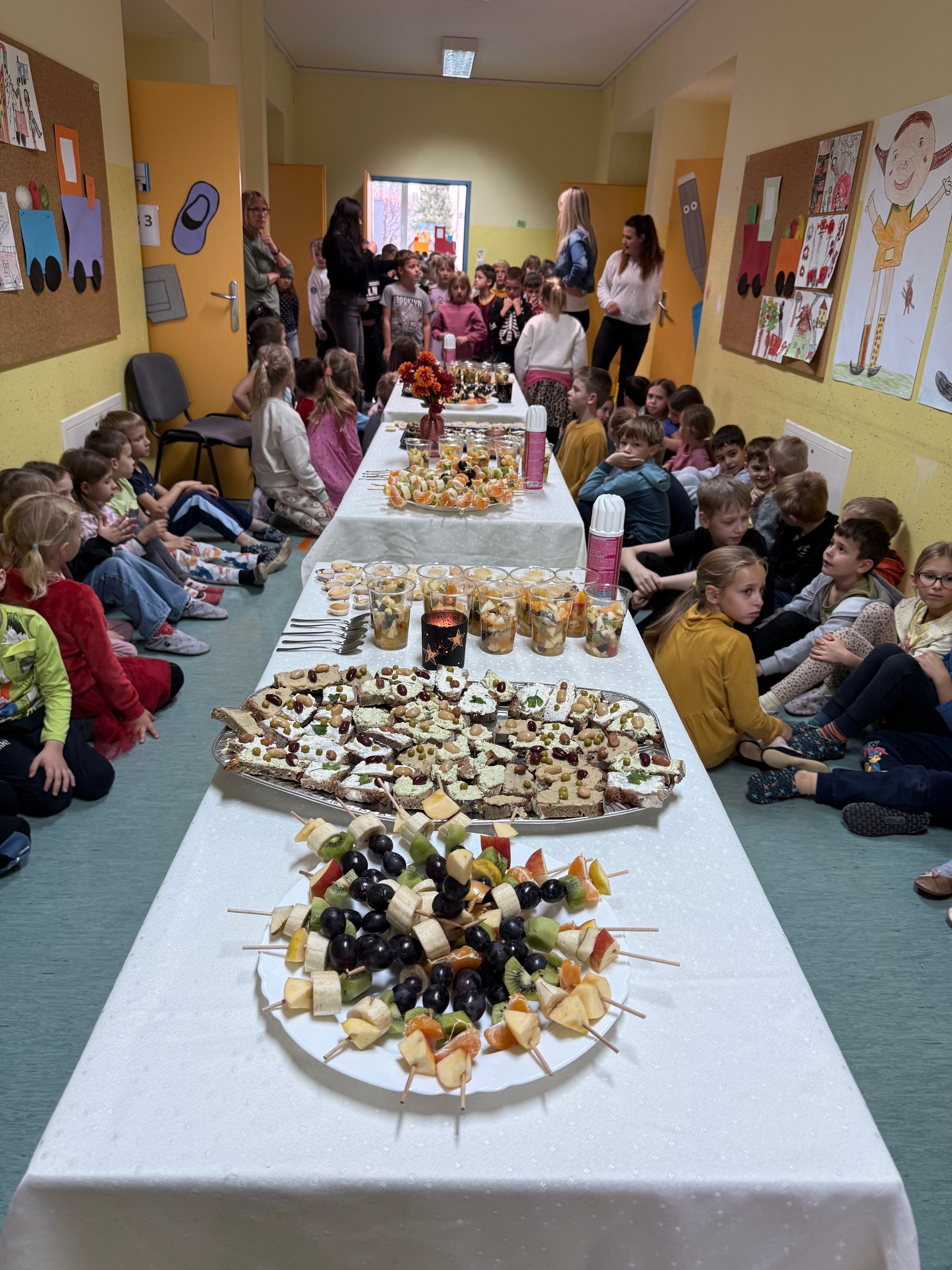 Po skupnem zajtrku smo se razredi lotili različnih praktičnih izzivov. Prvošolci so izdelovali zdrave namaze iz skute in stročnic. Drugošolci so pripravili bolj zdravo različico sladice, puhaste mafine. Tretješolci so ustvarjali sadne specialitete – sadna nabodala in sadne kupe ter ob tem vadili vzorce. Obiskali so tudi sejem zdravja, ki so ga pripravili petošolci. Ostali razredi pa smo se medtem naučili nov skupinski ples.