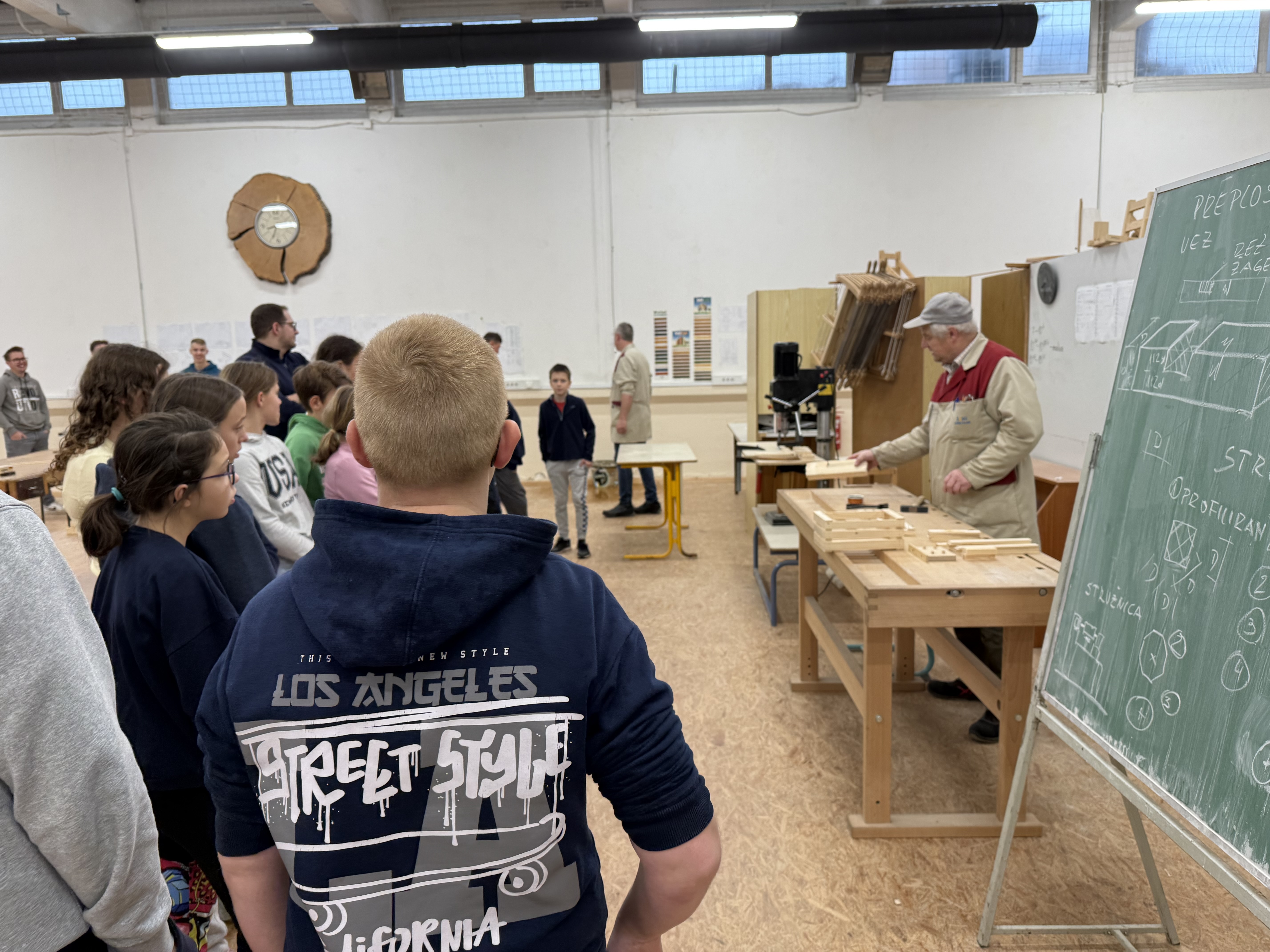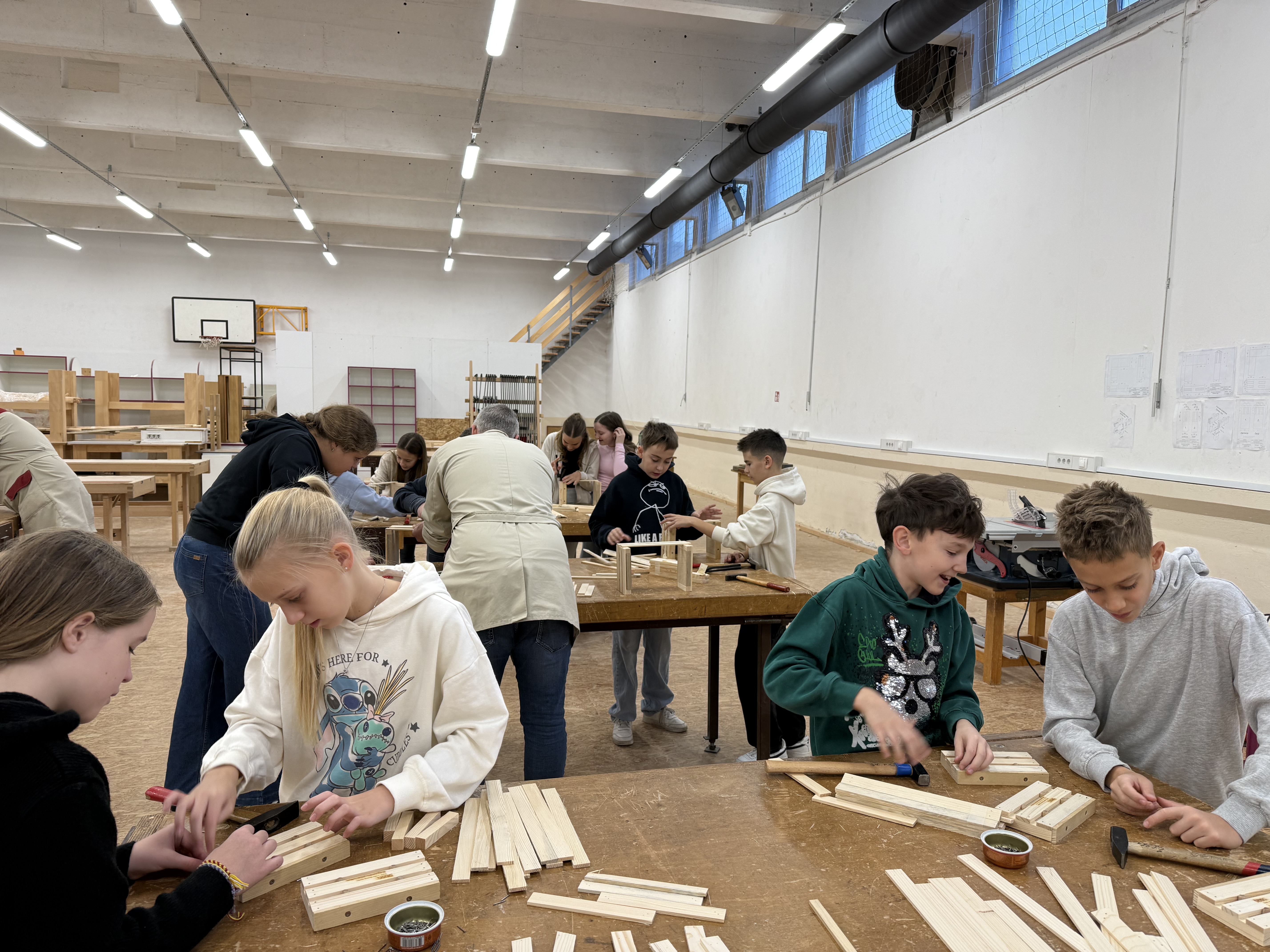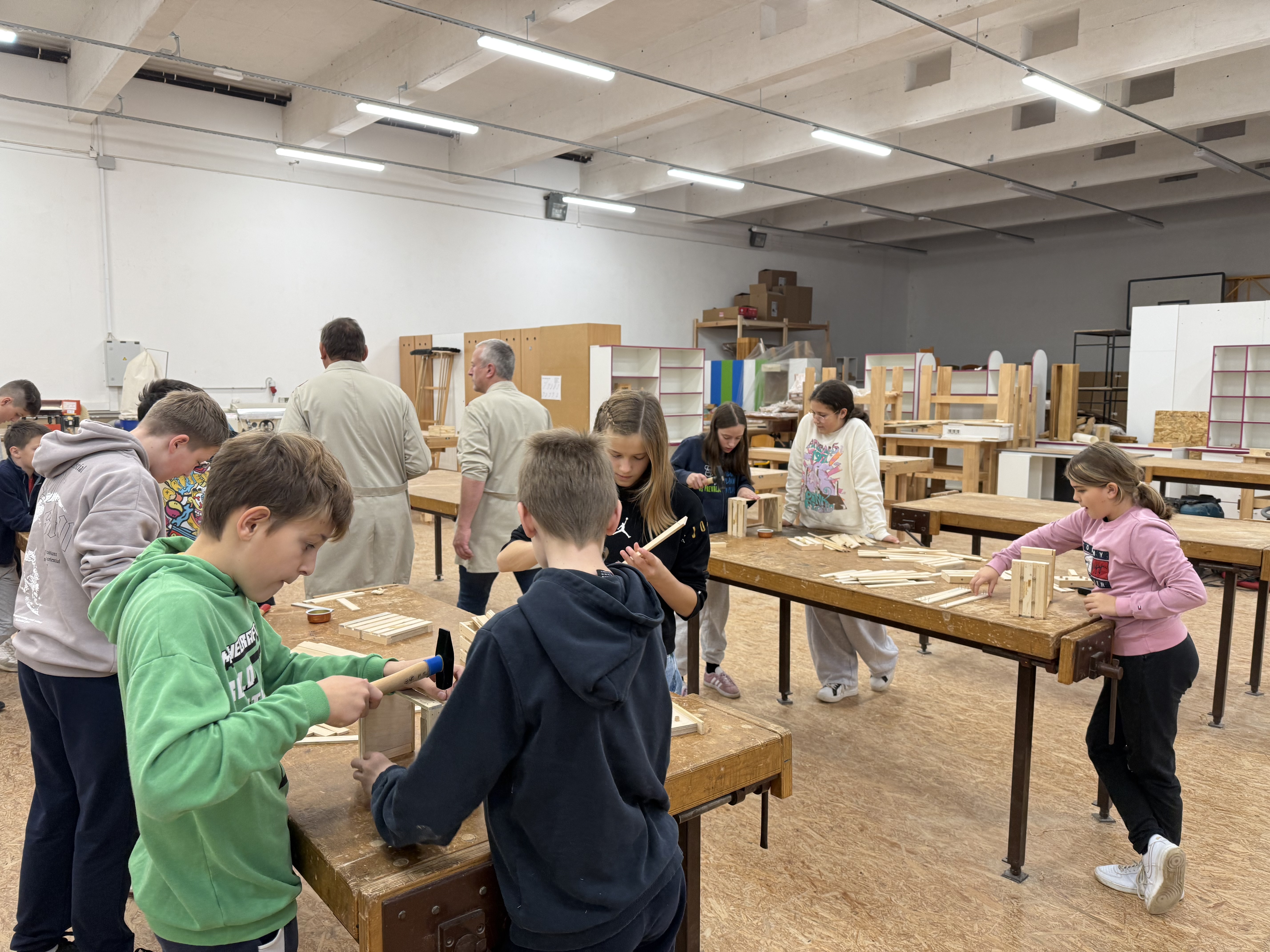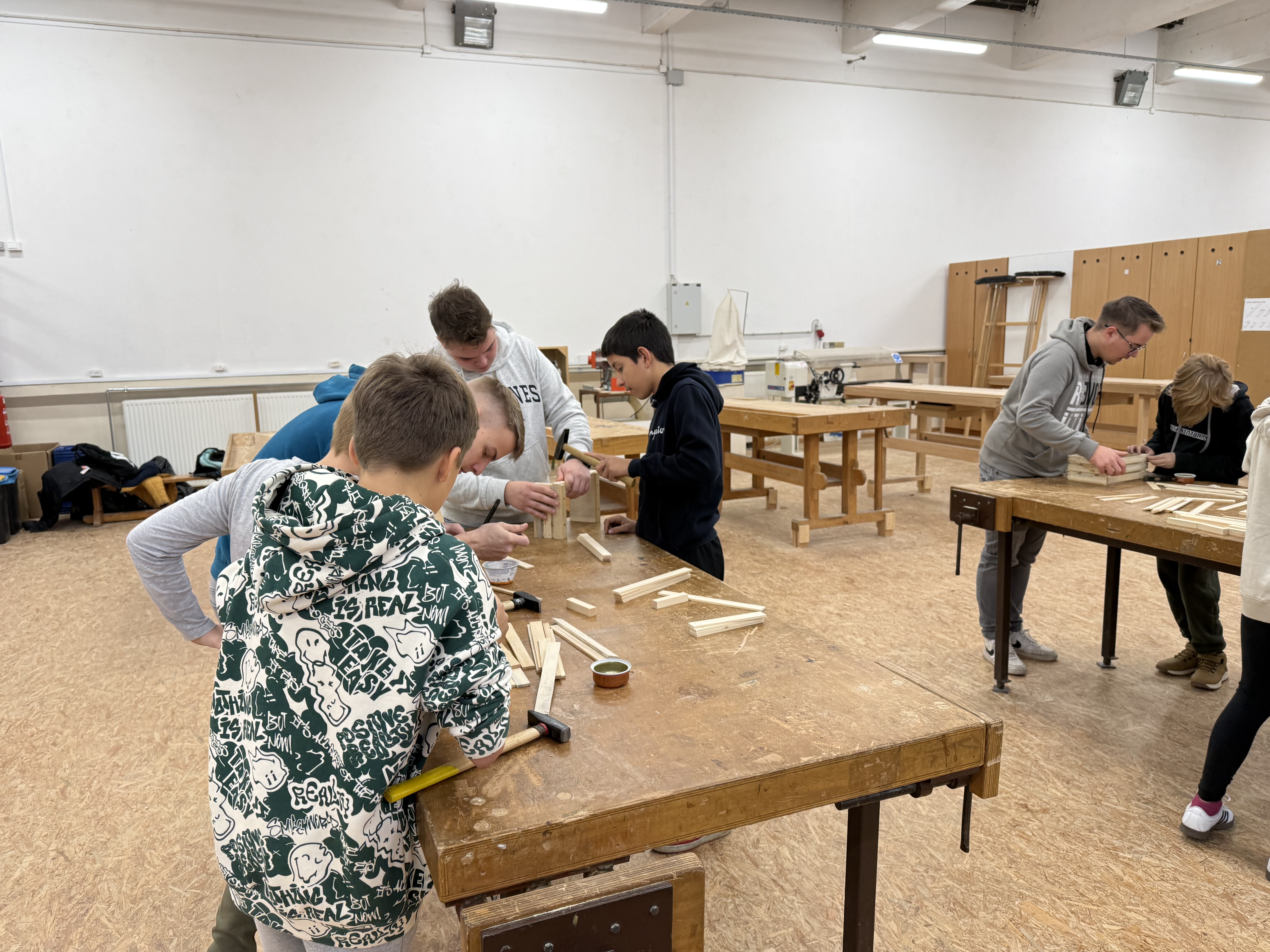Zjutraj smo prišli v šolo in ob pol osmih sedli k malici. Nato smo se z avtobusom odpeljali na Šolski center Slovenj Gradec, kjer so nas sprejeli profesorji in dijaki Srednje lesarske šole, ki so nam pomagali tudi pri izdelavi izdelkov. V parih smo izdelovali majhne lesene »gajbice« (zaboje).