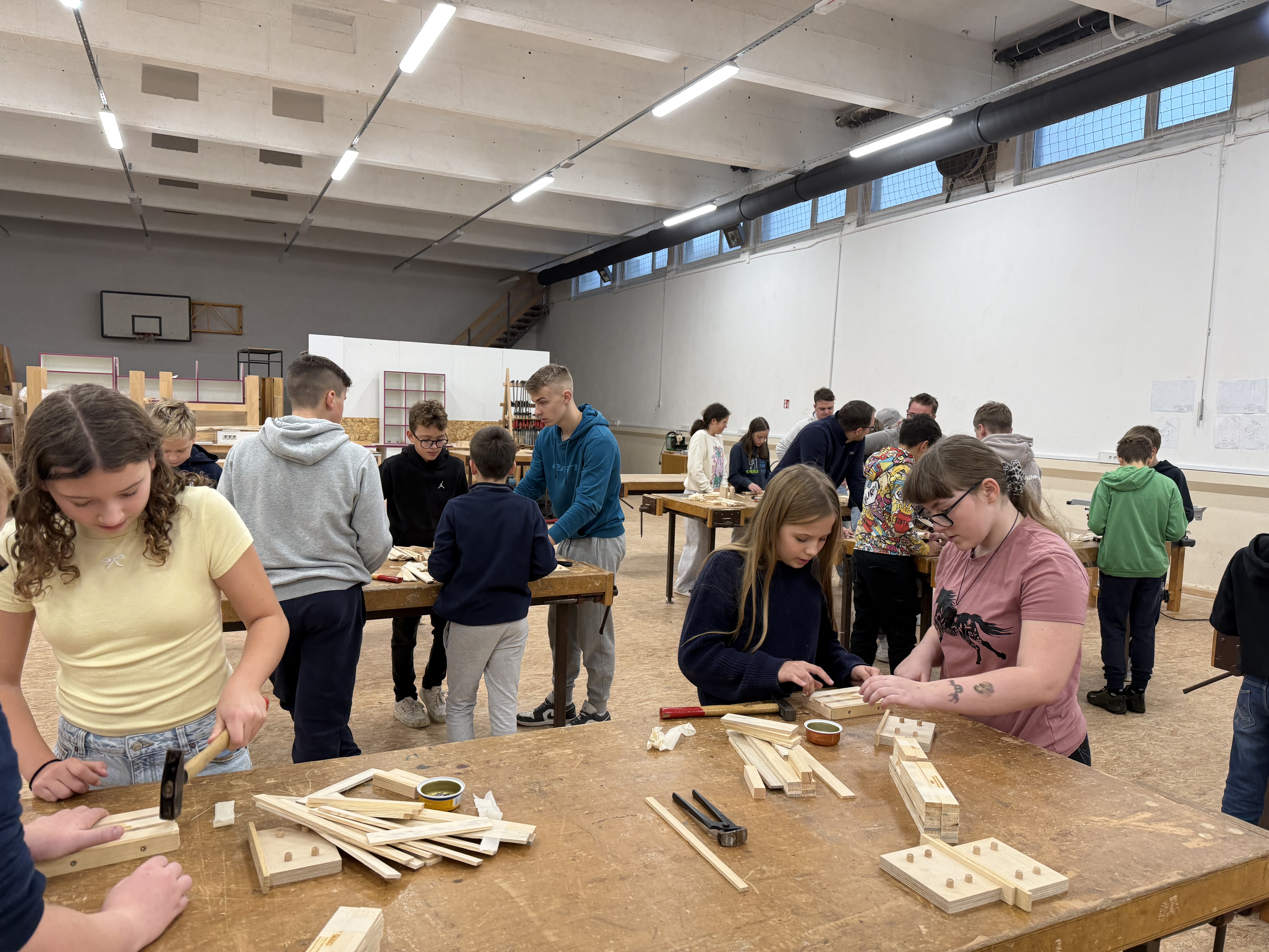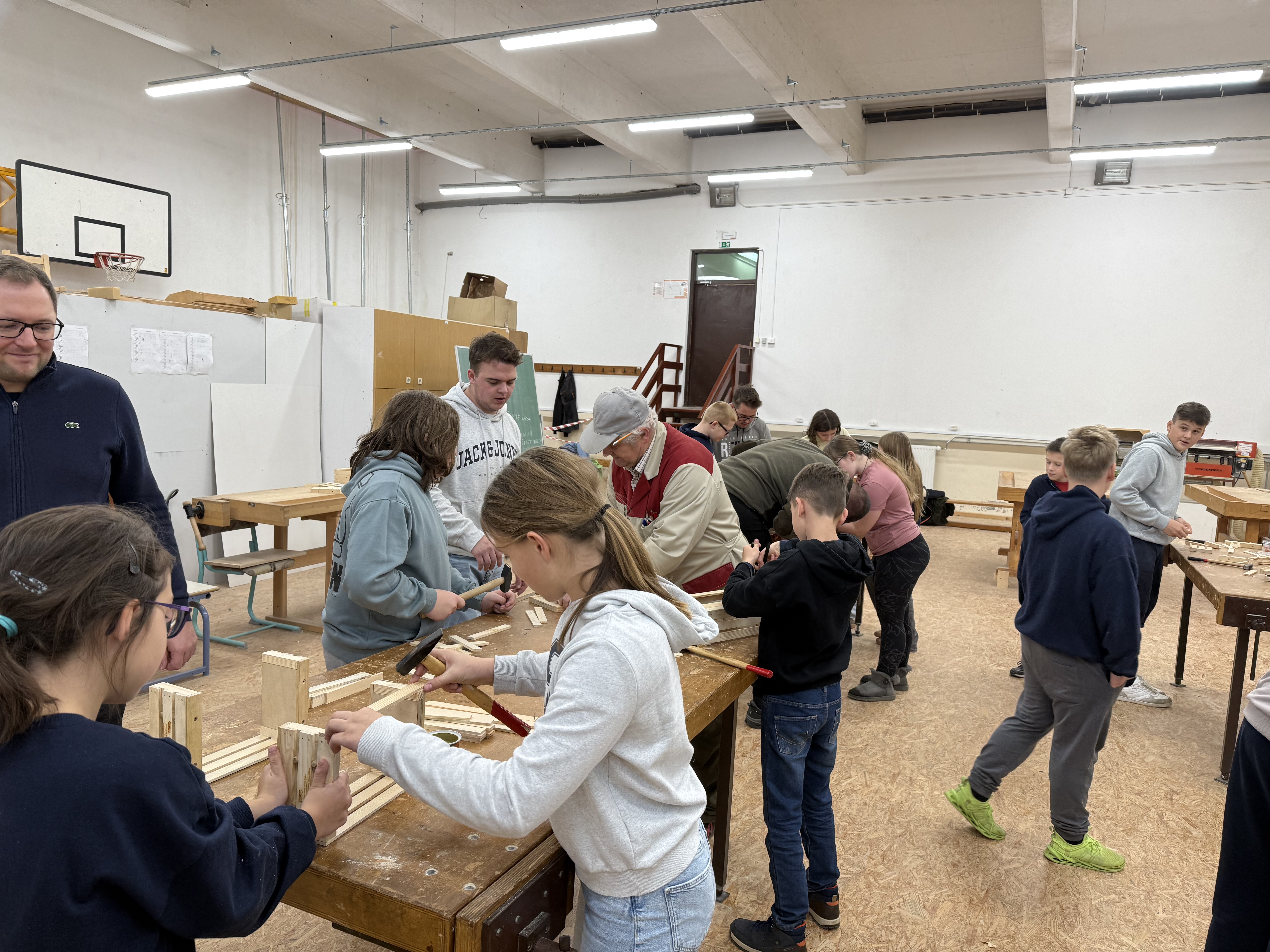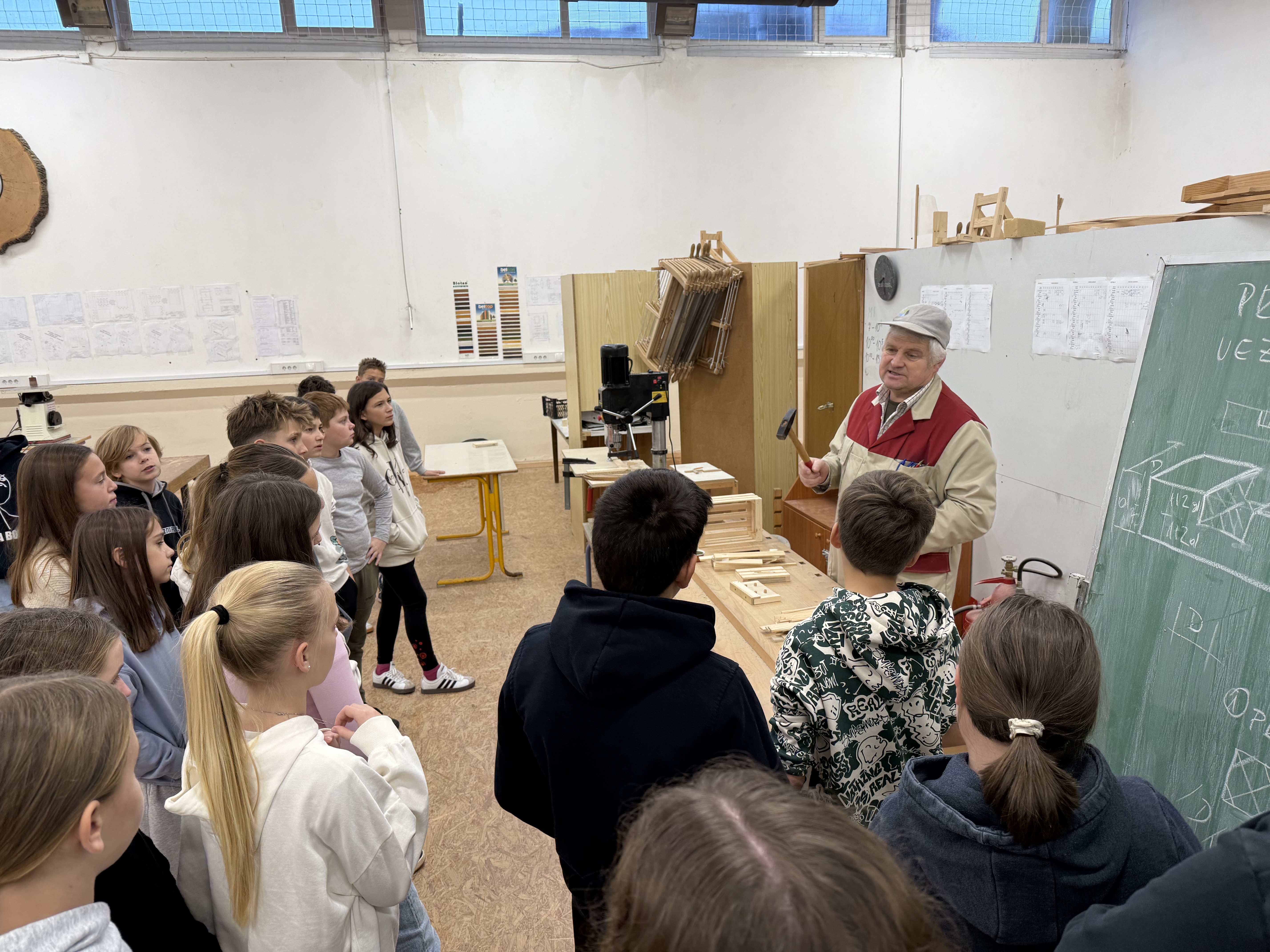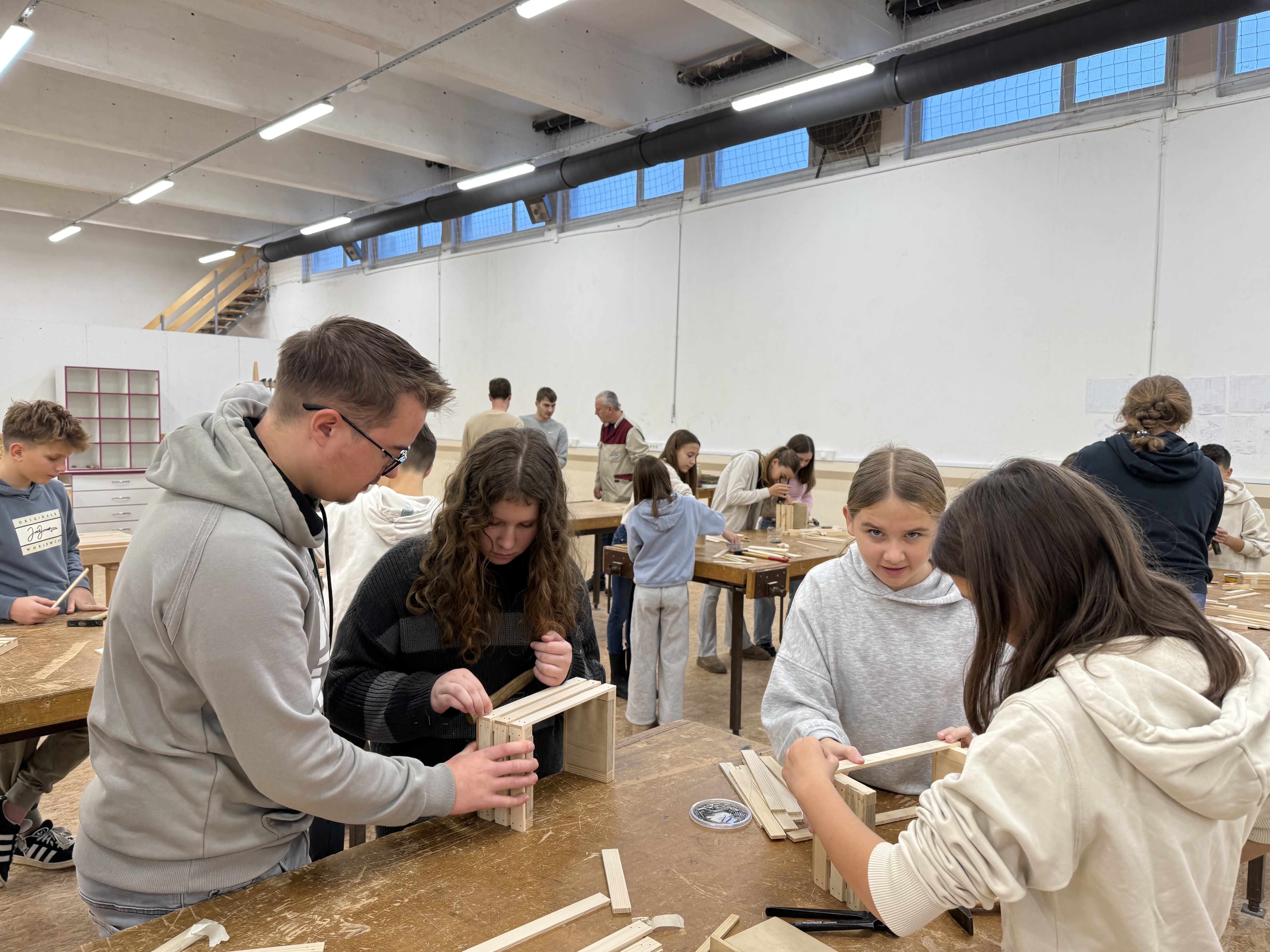 Zjutraj smo prišli v šolo in ob pol osmih sedli k malici. Nato smo se z avtobusom odpeljali na Šolski center Slovenj Gradec, kjer so nas sprejeli profesorji in dijaki Srednje lesarske šole, ki so nam pomagali tudi pri izdelavi izdelkov. V parih smo izdelovali majhne lesene »gajbice« (zaboje).