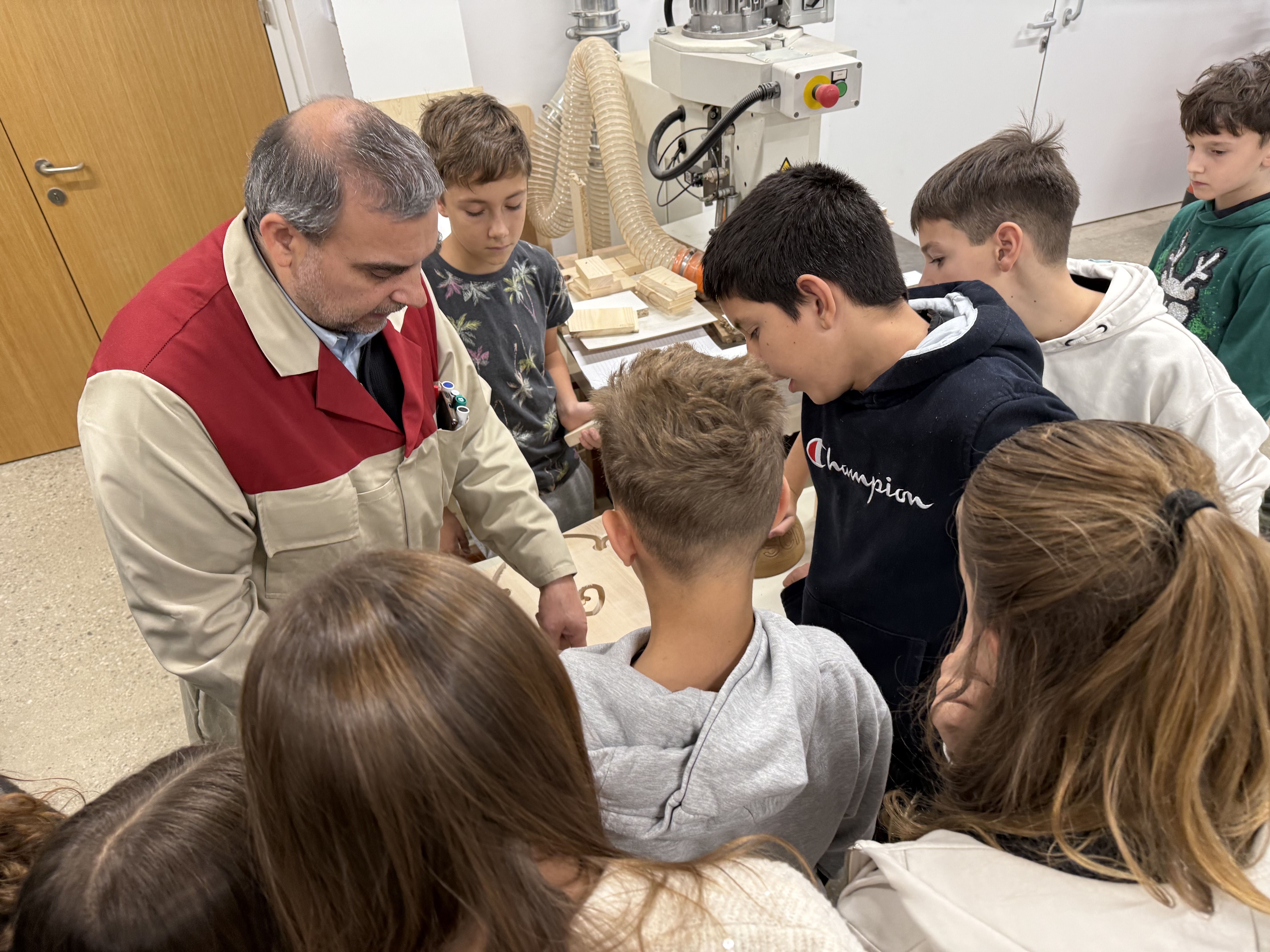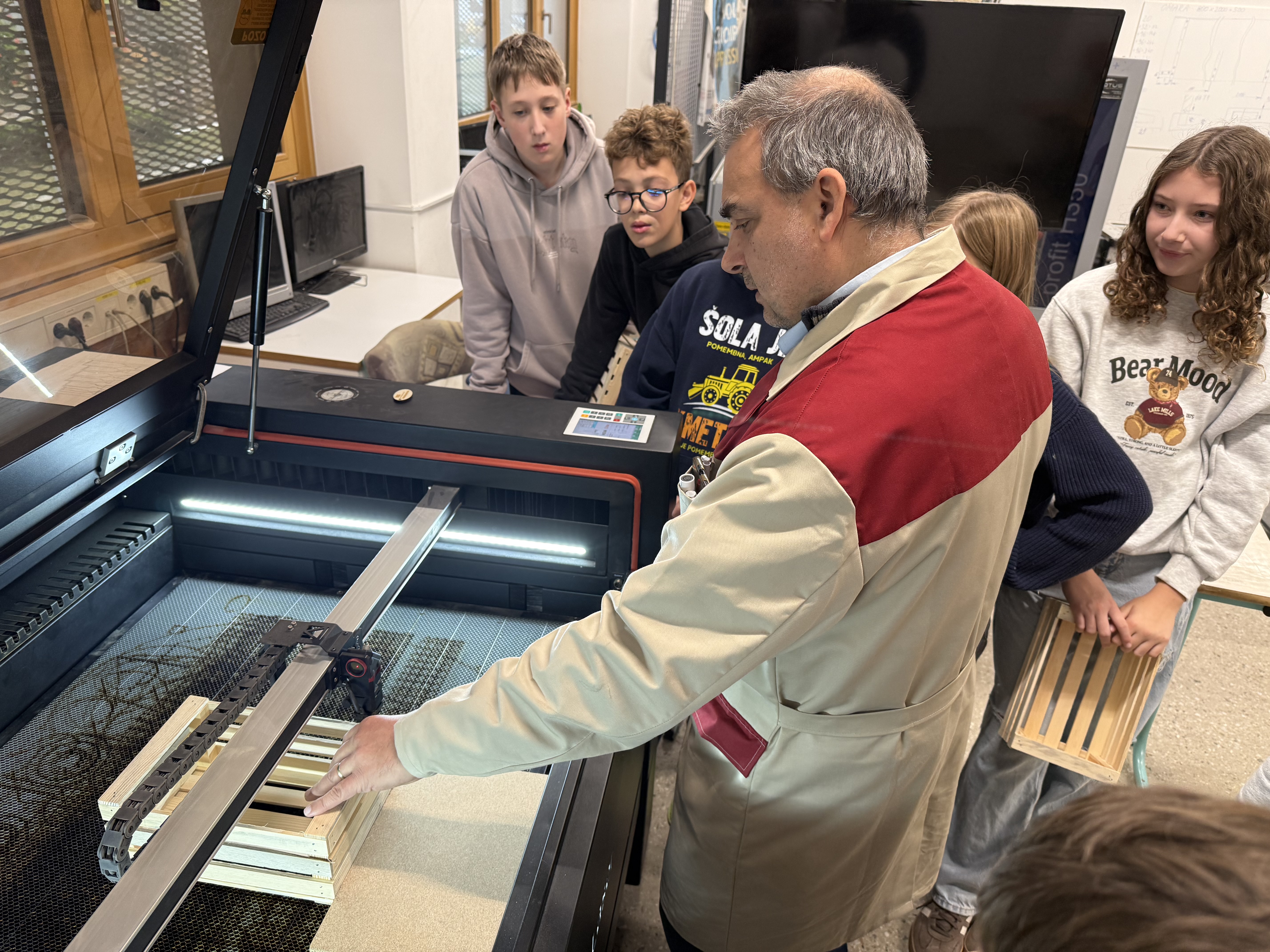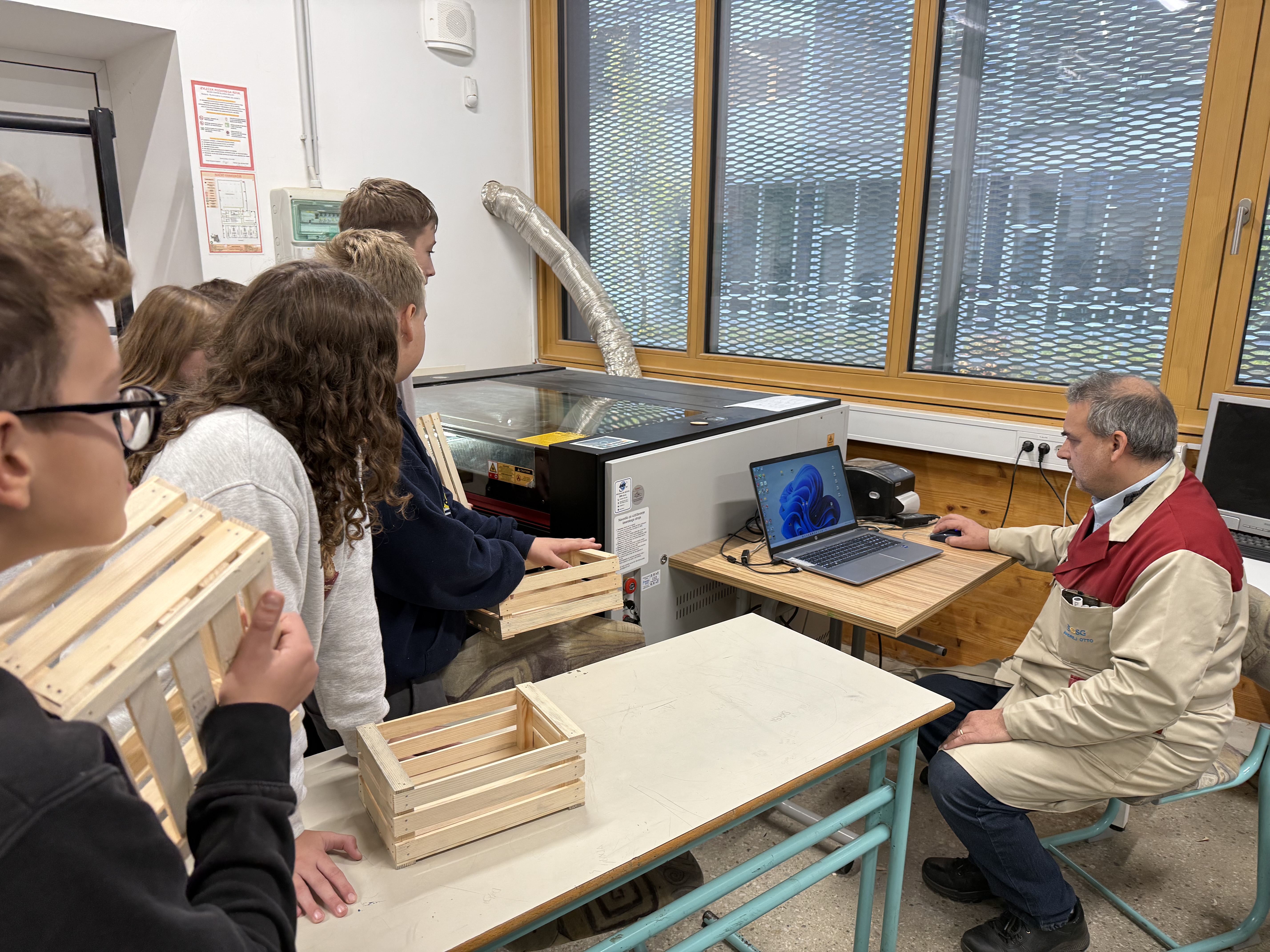 Nato smo šli še v delavnico, kjer smo si ogledali stroje, vrste lesa in košček tega tudi sami odžagali. Peljali so nas tudi v sobo z laserjem, kjer smo na gajbice napisali še svoje ime. Njihov profesor nam je razložil, kako deluje stroj za izrezovanje lesa.